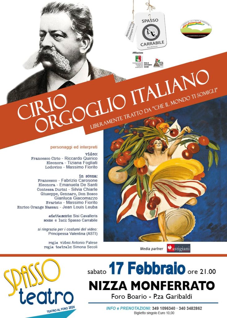 “CIRIO Orgoglio Italiano” è lo spettacolo teatrale, liberamente tratto dal romanzo “Che il mondo ti somigli. La Saga di Francesco Cirio” delle autrici Allegra Groppelli e Beba Slijepcevic, edizioni Sperling & Kupfer (anno 2022) che andrà in scena sabato 17 Febbraio alle ore 21,15 al Foro Boario di Nizza Monferrato,  proposto e interpretato dalla Compagnia Teatrale Spasso Carrabile co il patrocinio della città di Nizza Monferrato. Questo spettacolo fa parte della rassegna Spasso teatro 2024,che ha in questo 4° appuntamento la sua serata clou. Il Testo Teatrale è ispirato dalla vita e dalle gesta di Francesco Cirio, fondatore dell’omonima azienda conserviera (il cui marchio dal 2004 è detenuto dal colosso alimentare Conserve Italia) e nostro concittadino essendo Lui nato proprio a Nizza Monferrato il 24 Dicembre 1835: un giovane piemontese di umili origini che cercò il riscatto per sé e per la sua famiglia; una vita difficile in un contesto di una Italia Ottocentesca dominata da forti divisioni sociali. La sua strada, sempre in salita, fu piena di imprevisti, ma il sogno di diventare qualcuno era troppo forte e Lui lo diventò al punto di essere ancor oggi un vero Orgoglio italiano. Questo spettacolo è un suggestivo e coinvolgente lavoro Teatrale che unisce veritieri riferimenti storici a parti romanzate, il tutto per offrire al pubblico una proposta che merita proprio di essere vista, per godere appieno di un personaggio che ha lasciato davvero il segno. Biglietto Euro 10,00. Per prenotazioni rivolgersi a : 3403482862 anche su Whatsapp
