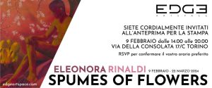 Una nuova galleria d’arte contemporanea ha aperto venerdì 9 febbraio, a Torino. Situata nel cuore della città, in Via della Consolata 17/C, EDGE ART SPACE è una galleria di nuova generazione che si rivolge in particolar modo alla promozione di artisti emergenti su scala internazionale e diretta e fondata da Margherita Artoni e Riccardo Fattore. La mostra che inaugura l’apertura dello spazio è dell’artista Eleonora Rinaldi che presenta “Spumes of Flowers” individuando nella poesia “Le Bateau Ivre” di Arthur Rimbaud la principale fonte di ispirazione per la sua progressiva indagine pittorica.