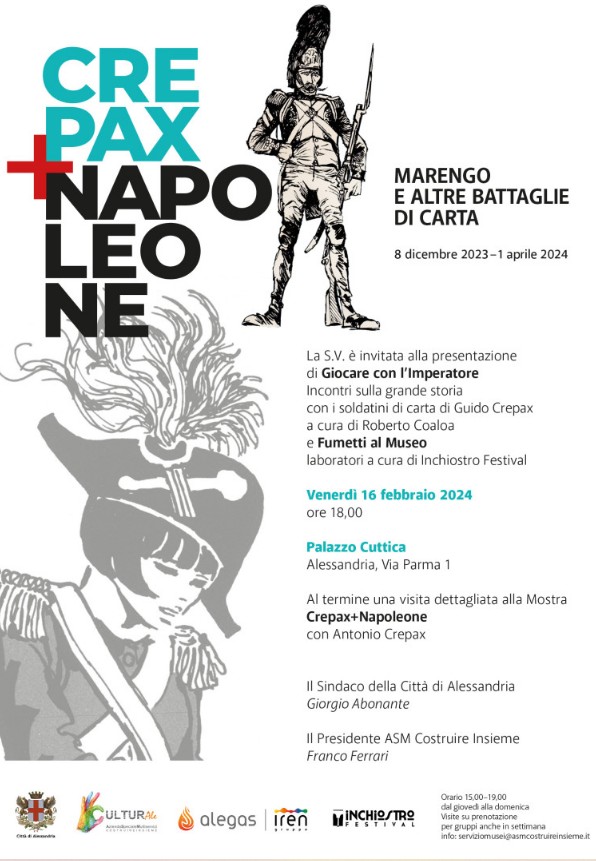 Venerdì 16 febbraio alle ore 18 a Palazzo Cuttica sarà presentato, nell’ambito degli eventi collaterali alla mostra “Crepax + Napoleone – Marengo e altre battaglie di carta” che sarà prorogata fino al 1° aprile 2024, il progetto “Giocare con l’Imperatore”, organizzato da Città di Alessandria e ASM Costruire Insieme.