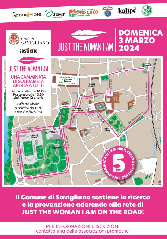 JUST THE WOMAN I AM – ON THE ROAD Adesione del COMUNE DI SAVIGLIANO il 03 MARZO 2024 con ritrovo alle 10 presso Parco Graneris