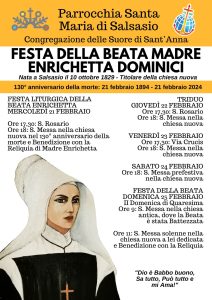 Mercoledì 21 febbraio, festa liturgica di Madre Enrichetta, alle 17,30 verrà recitato il Rosario e alle 18 la Messa nella chiesa nuova in via Novara 102, nel giorno del 130esimo anniversario della morte: 21 febbraio 1894 – 21 febbraio 2024. In conclusione della Messa verrà impartita la Benedizione con la Reliquia della Beata.