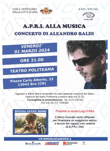 Il cantautore toscano Aleandro Baldi si esibirà in Piemonte allo scopo di sostenere ed aiutare le attività benefiche portate avanti dall’Associazione Pro retinopatici e Ipovedenti (A.P.R.I.-odv) Nella mini tournèe è previsto anche un concerto presso il Teatro Politeama di Bra. L’evento, patrocinatod al comune, si svolgerà