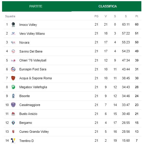 In quel di Trento molto vicina a strappare punti alla Reale Mutua Fenera Chieri ’76 l’Itas Trentino di coach Mazzanti, dopo aver perso il primo set 27-29 vince il secondo ma cede nelle due frazioni finali. Prestazione monstre a muro delle collinari, con 17 blocks vincenti, 9 da una clamorosa Weitzel (12 punti) e 6 da Zakchaiou. Poi, altra grande prova di Skinner, top scorer con 27 punti, mentre per le trentine si fermano ai 15 di Michieletto e ai 13 di Acosta.