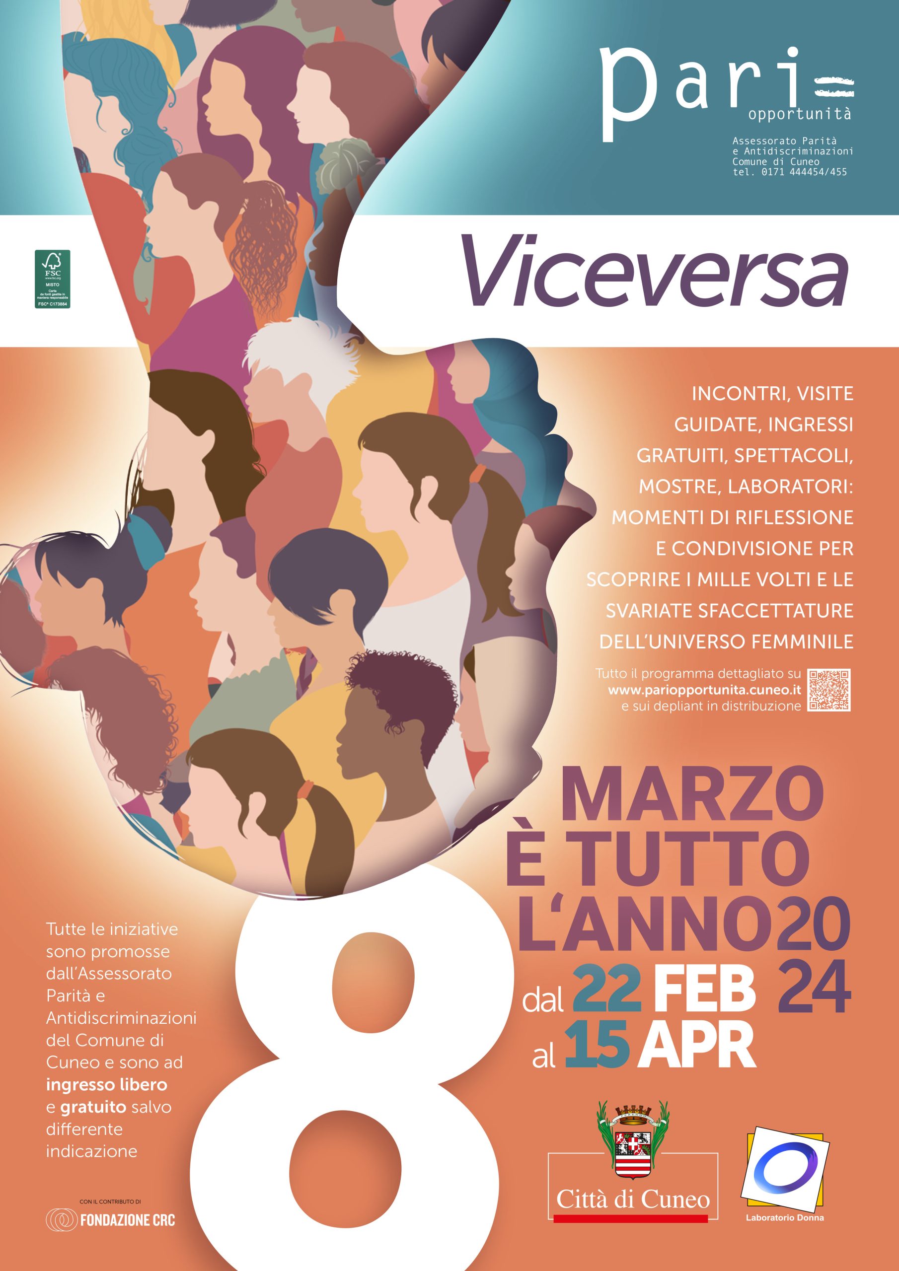 “8 marzo è tutto l’anno” è l’annuale rassegna di appuntamenti proposta dall’assessorato parità e anti discriminazioni del Comune di Cuneo che prende spunto dalla Giornata internazionale della donna e vive e cresce grazie alla collaborazione tra il pubblico e il privato sociale in un’ottica di ricerca di sinergie che spaziano dalla condivisione delle proposte, allo scambio degli spazi fisici, alla promozione attraverso i singoli canali propri dei vari organizzatori. Il mese di marzo si presenta ricco di appuntamenti e iniziative, momenti di riflessione e condivisione per collaborare alla creazione di una cultura di pari opportunità, per sviluppare una comunità coesa e inclusiva, per dare maggior visibilità e valore ai mille volti e alle svariate sfaccettature dell’universo femminile. L’edizione 2024 è dedicata al “Viceversa”, considerato nella sua accezione più ampia: il viceversa nelle incombenze quotidiane, il viceversa nei giochi dei bambini, il viceversa come evoluzione interiore che una donna può compiere nell’arco della sua vita proprio in quanto donna.