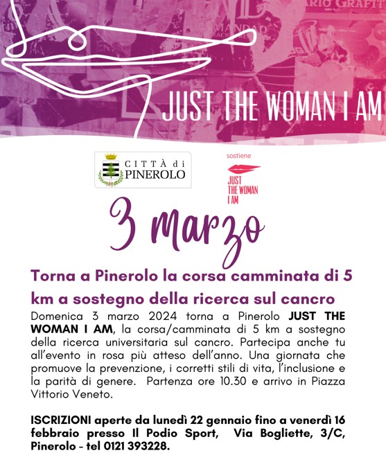Domenica 3 marzo 2024 torna a Pinerolo JUST THE WOMAN I AM, la corsa/camminata di 5 km a sostegno della ricerca universitaria sul cancro. Una giornata che promuove la prevenzione, i corretti stili di vita, l’inclusione e la parità di genere.