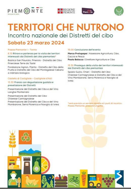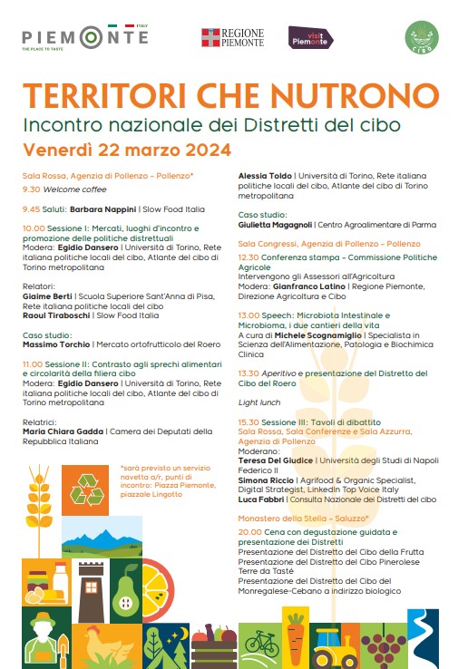 Dal 21 al 23 marzo la Regione Piemonte, Assessorato Agricoltura e Cibo, in collaborazione con la Consulta nazionale dei Distretti del cibo, organizzerà tre giorni di confronto sui temi forti delle politiche di aggregazione e promozione dei territori, dell’organizzazione dei mercati, dello spreco alimentare, della valorizzazione dei paesaggi, dell’enogastronomia e dei percorsi turistici. L’evento partirà dalla sede della Regione Piemonte, per spostarsi a Pollenzo e nei territori interessati dai Distretti del Cibo.