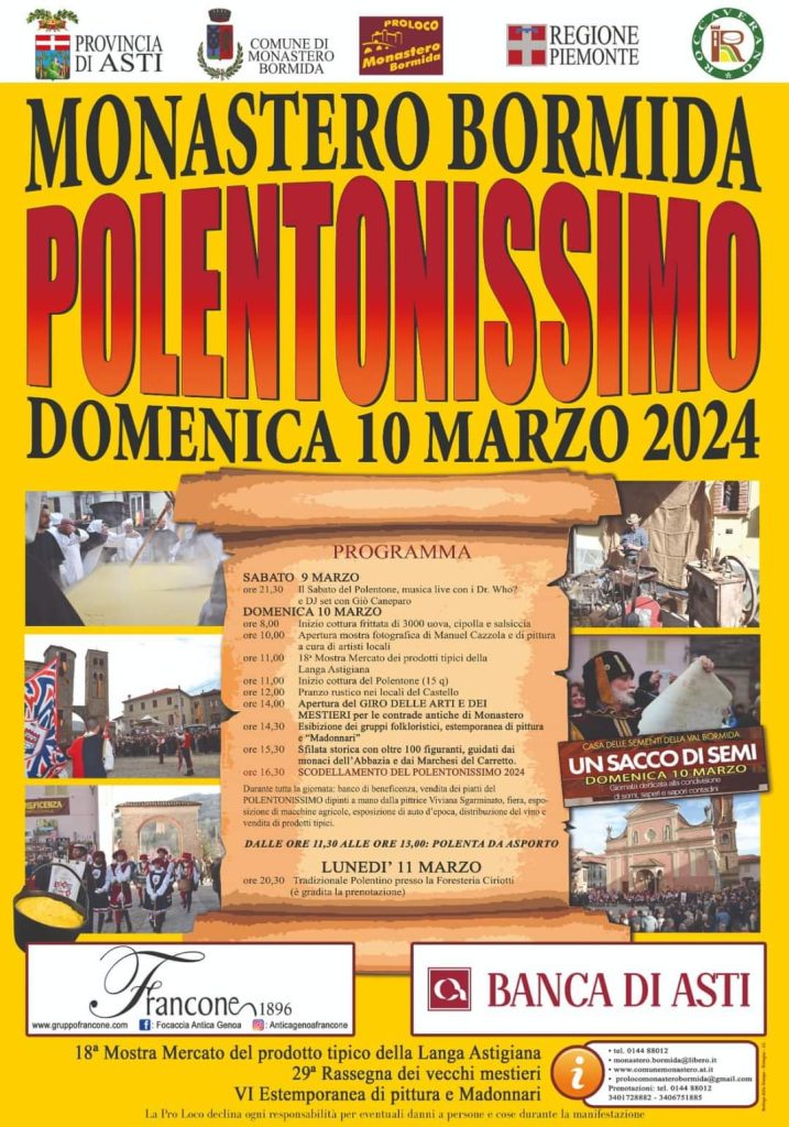 POLENTONISSIMO 2024 DI MONASTERO BORMIDA DOMENICA 10 MARZO ANTICHI MESTIERI, PRODOTTI TIPICI, SBANDIERATORI, MOSTRA AVICOLA ORNAMENTALE E ESTEMPORANEA DI PITTURA