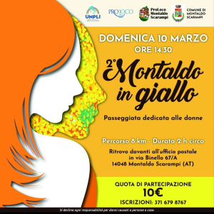 L’8 marzo è la Giornata Internazionale della Donna, da sempre un’occasione per riflettere sulla condizione femminile nella società contemporanea, sulle conquiste fatte e su quelle ancora da fare in prospettiva di una parità effettiva e nello stesso tempo un’occasione di festa e di celebrazione. La pro loco di Montaldo Scarampi con il contributo del comune festeggerà la ricorrenza con la “Camminata in giallo”, il colore che per eccellenza esprime vitalità, forza e gioia di vivere e richiama la mimosa, fiore caratteristico di questo mese. Torna la nuova edizione della camminata dedicata alle donne, con le donne (e non solo) e per le donne. Uomini e donne cammineranno insieme, di pari passo. E’ importante la presenza di uomini e donne a questa camminata, perché dobbiamo sostenerci a vicenda e lavorare insieme, affinché nessun diritto sia calpestato e affinché mai più nessuna donna debba aver paura di un uomo. Domenica 10 marzo, a partire dalle 14,30, avrà luogo l’evento intitolato “Montaldo in giallo”, giunto alla 2^ edizione: si parte sempre davanti all’ufficio postale, da qui il serpentone si snoderà lungo i sentieri che dal paese attraversano le colline, per poi ritornare verso l’abitato del paese alla sua Chiesa parrocchiale ed infine ritornare al punto di partenza. L’iscrizione al costo di 10€, comprende: maglietta dell’evento e merenda. Non potete mancare! Iscrivetevi subito! Una proposta speciale e significativa per festeggiare le donne e chi le accompagna, all’aria aperta, sulle belle e panoramiche colline del territorio di Montaldo che fanno parte del Patrimonio Unesco, dove si produce la pregiata Barbera. Il percorso offre molti spunti per raccontare un territorio ricco di storia e curiosità. I camminatori avranno a disposizione una simbolica maglietta colore mimosa, da indossare durante la passeggiata. Il percorso è di circa 6 Km. per circa 2 ore di cammino. Si consigliano: calzature da trekking, scorta d’acqua e abbigliamento comodo. La Giornata Internazionale della Donna nasce per ricordare l’incendio del 1908 nella fabbrica tessile di New York dove le operaie rimasero vittime dell’incendio divampato all’interno dell’azienda, dove erano state segregate dai proprietari in risposta allo sciopero indetto dalle lavoratrici che chiedevano condizioni di lavoro migliori e salari più alti. Il fumo sprigionato dall’edificio, visibile da quasi tutta la città, era viola a causa dei colori dei tessuti utilizzati dalla fabbrica di camicie. Per questo motivo da quel momento in poi il viola fu associato alle battaglie per la rivendicazione dei diritti delle donne anche, in seguito, dalle suffragette. Camminata per festeggiare tutte le donne che lottano quotidianamente per avere anche solo rispetto. Al termine ritrovo alle Cantine Garelli, ove la pro loco servirà la merenda per deliziare un lieve momento di riflessione.