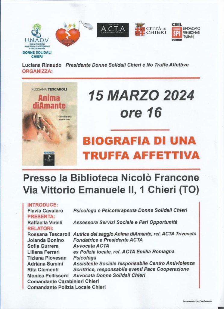 Chieri. Donne Solidali. “Biografia di una truffa affettiva”, 15 marzo in Biblioteca di Redazione · 4 Marzo 2024 Visto da: 174