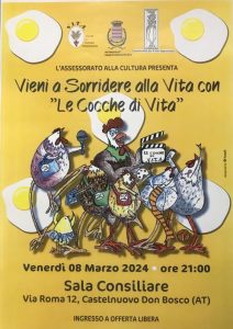 Dopo la prima assoluta dell’ottobre scorso e sull’onda del successo ottenuto dalle bravissime donne di V.I.T.A., torna lo spettacolo teatrale “Le cocche di Vita!”.   Lo si potrà vedere Venerdì 8 marzo alle ore 20,45 nella sala consiliare del Comune di Castelnuovo Don Bosco in Via Roma 12, ospiti dell’Amministrazione Comunale guidata dal sindaco Antonio Rago e con la preziosa collaborazione delle assessore Valentina Pezzutti e Cristina Pukly. Lo spettacolo nasce da un’idea di Andreina Rocco e coinvolge una trentina di socie dell’associazione più un “gallo” ed un “pulcino”; entrambi saranno una vera sorpresa. È stato un lungo lavoro, ma tra leggerezza e evasione, le donne di V.I.T.A. hanno scritto un sapiente copione, hanno inventato la sceneggiatura, creato e cucito i costumi. È stato un lavoro corale, impegnativo ma gratificante, come lo sono tutte le attività di questa associazione che si impegna ogni giorno a sostenere le donne che, malgrado loro, hanno dovuto addentrarsi a un percorso di vita complicato.