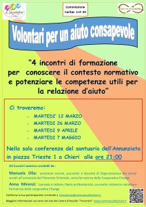 Il volontariato in Italia è una realtà consolidata e, spesso, allevia e integra la struttura pubblica che si occupa di assistenza alle molte persone che hanno necessità di essere aiutate. Ma occorre essere preparati. E per questo ci hanno pensato alcune realtà associative chieresi che, dalla collaborazione tra la Commissione Caritas dell’Unità Pastorale TO59, il Centro di Ascolto “l’incontro” e Reciprocamensa, hanno fatto sì che potesse proposto un corso di formazione per i volontari che operano nel sociale. Questo corso si rivolge sia a chi sta intraprendendo un percorso di volontariato sia a chi già sta facendo volontariato, ritenendo importante mantenersi aggiornato e acquisire nuove competenze. Avrà l’obiettivo di aiutare i volontari a conoscere il contesto normativo in cui operano e potenziare le competenze utili per la relazione d’aiuto. Il corso, di 4 incontri, inizierà martedì 12 marzo e si concluderà il 7 maggio. Questo è il programma dettagliato degli incontri: