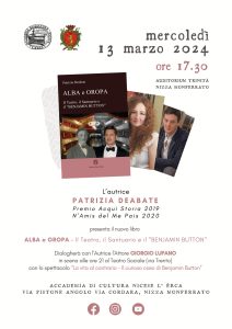 Mercoledì 13 Marzo alle ore 17:30 si terrà all’Auditorium Trinità di Nizza Monferrato (Via Pistone, angolo Via Cordara) la presentazione del libro ALBA e OROPA. Il Teatro, il Santuario e “Il Benjamin Button” di Patrizia Deabate, con la partecipazione straordinaria dell’attore Giorgio Lupano: evento promosso dall’Accademia di Cultura Nicese “L’Erca” e dall’Assessorato alla Cultura della Città di Nizza Monferrato.