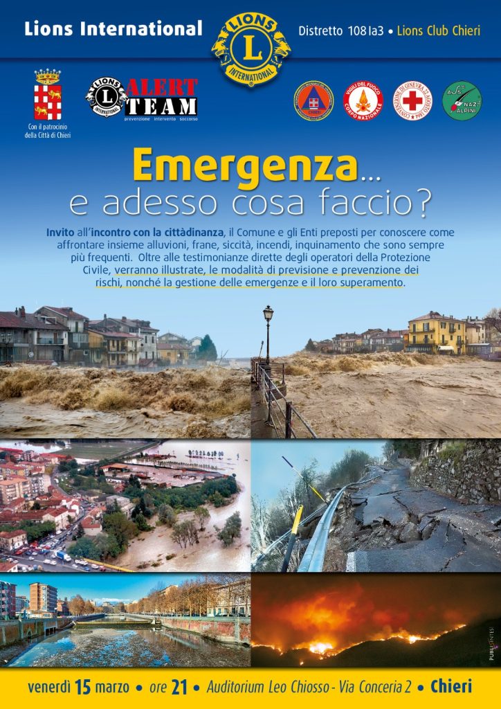 Il LIONS Club di Chieri in collaborazione con la protezione civile locale, ha organizzato un incontro in favore della cittadinanza, al fine di diffondere le buone regole da adottarsi in caso di emergenza. Alla serata che avrà luogo venerdì 15 marzo ore 21 presso l’auditorium Leo Chiosso in Via Conceria, 2 Chieri (TO) patrocinata del Comune di Chieri, saranno presenti le principali organizzazioni locali che costituiscono il sistema di protezione civile, tra le quali Vigili del Fuoco, Croce Rossa Italiana ed Associazioni di volontariato, oltre al Sindaco Alessandro Sicchiero in qualità di autorità territoriale di Protezione Civile.