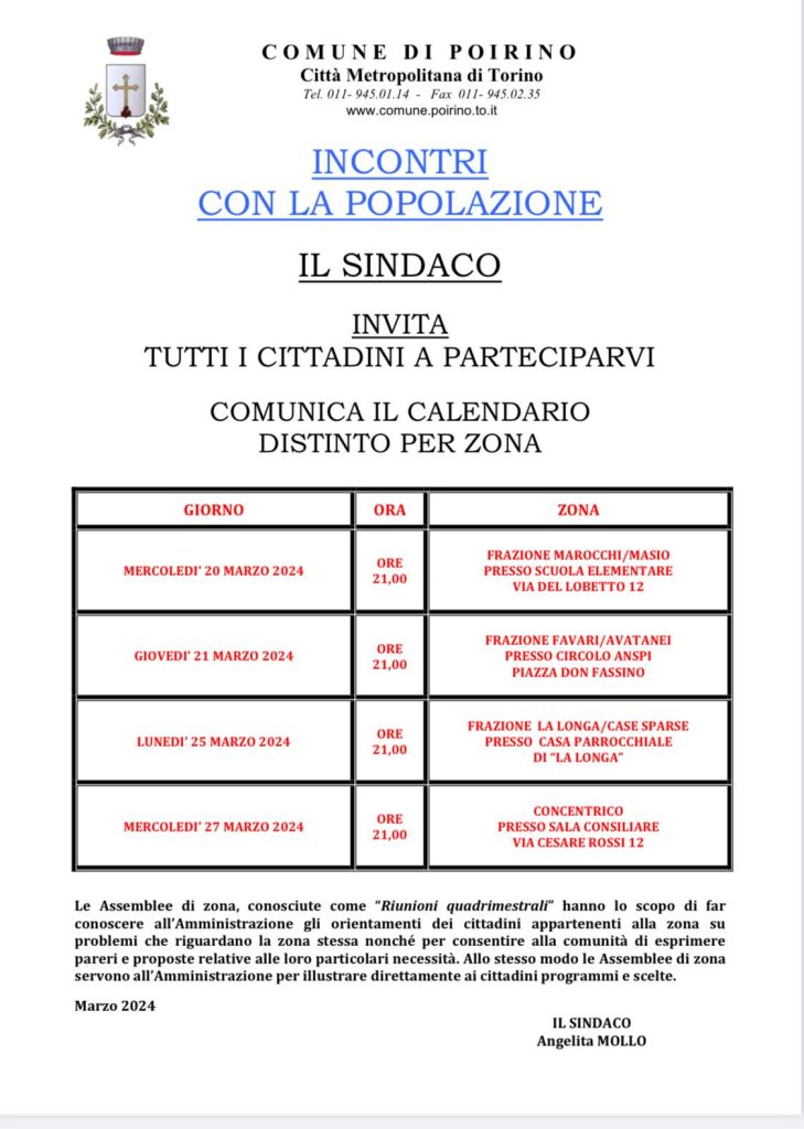 Poirino. Il calendario degli incontri del Sindaco con la popolazione di Redazione · 12 Marzo 2024 Visto da: 172
