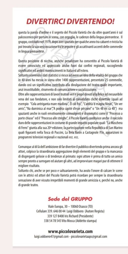 Info Teatro Superga, via Superga 44, Nichelino (TO) 011 6279789 www.teatrosuperga.it biglietteria@teatrosuperga.it
