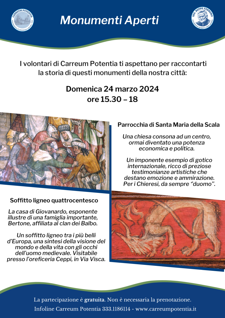 Secondo appuntamento della rassegna di “Monumenti Aperti 2024”: per scoprire i luoghi più suggestivi della nostra città, a cura dei volontari dell’associazione culturale Carreum Potentia – ODV. Vi aspettiamo domenica 24 marzo, dalle 15:30 alle 18, in due luoghi ricchi di splendide decorazioni, testimonianze della potenza economica e politica della città e dei suoi abitanti: la Parrocchia di Santa Maria della Scala, più comunemente conosciuta come Duomo situato in pieno centro città, e il raro soffitto ligneo quattrocentesco, uno tra i più belli d’Europa, visitabile presso l’oreficeria Ceppi in via Visca. L’evento è gratuito, non è necessario prenotarsi, per ulteriori informazioni chiamare al numero 333-1186114. Per seguire il calendario dei #MonumentiAperti2024 consultare il sito www.carreumpotentia.it
