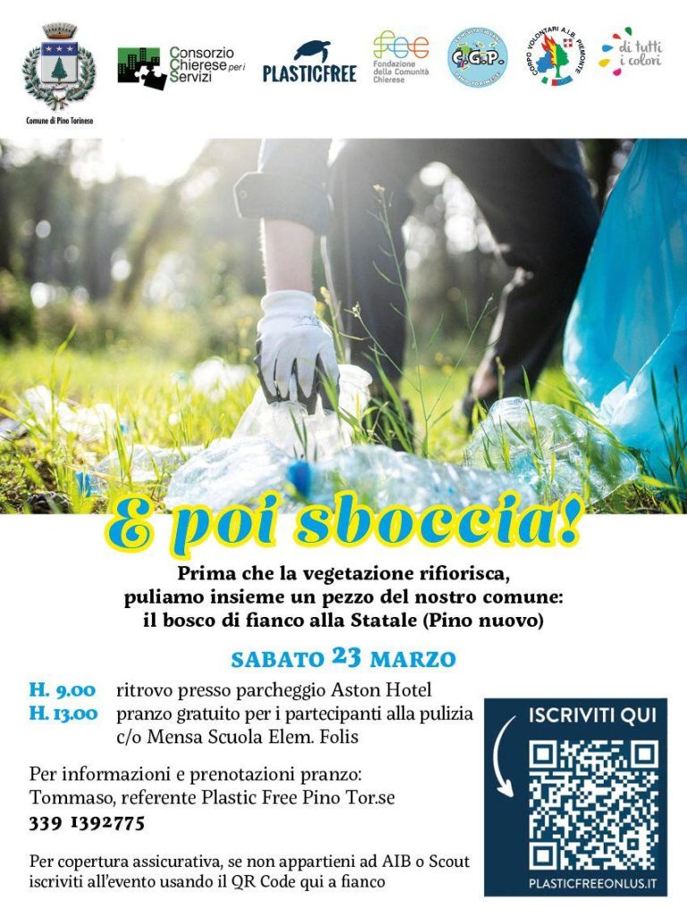 Sabato 23 marzo il Comune di Pino Torinese propone una giornata di pulizia volontaria del bosco di fianco alla Statale (Pino nuovo), alla quale sono invitati a partecipare tutti i cittadini, le cittadine e le associazioni del territorio. A seguire, pranzo gratuito per tutti i partecipanti presso la Scuola Primaria “Folis”! Ore 9:00 ritrovo presso parcheggio Aston Hotel Ore 13:00 pranzo gratuito per i partecipanti Per informazioni e prenotazioni pranzo: Tommaso, referente Plastic Free Pino Torinese 339 1392775 Per iscriverti inquadra il QR code che trovi sulla locandina o CLICCA QUI