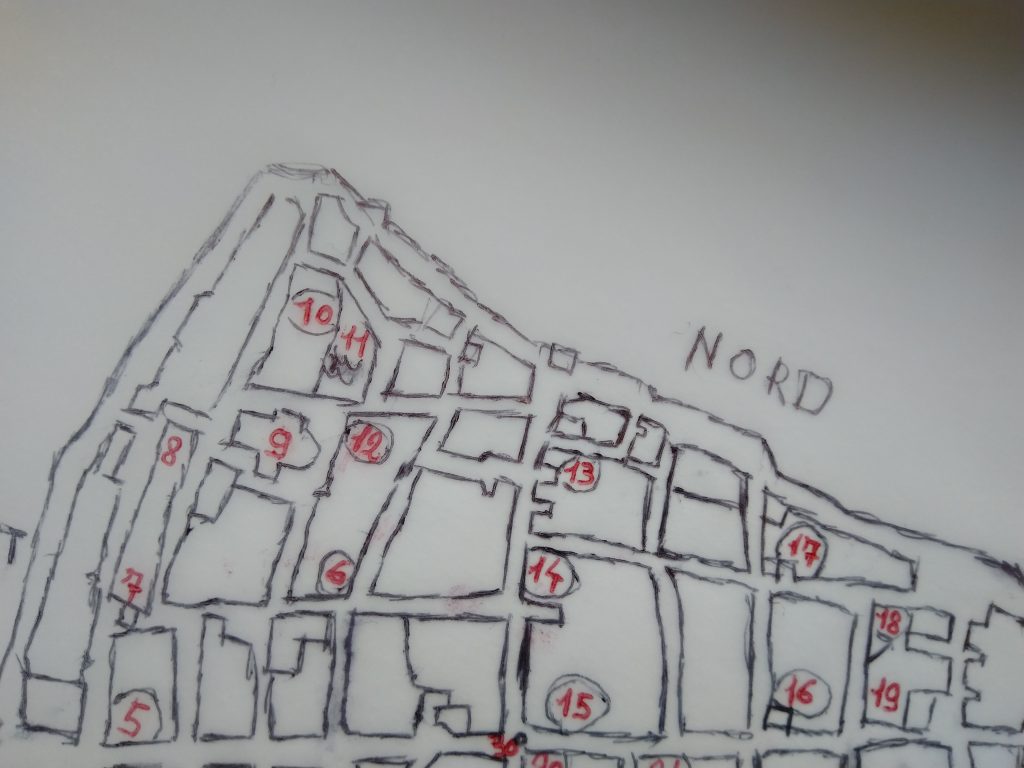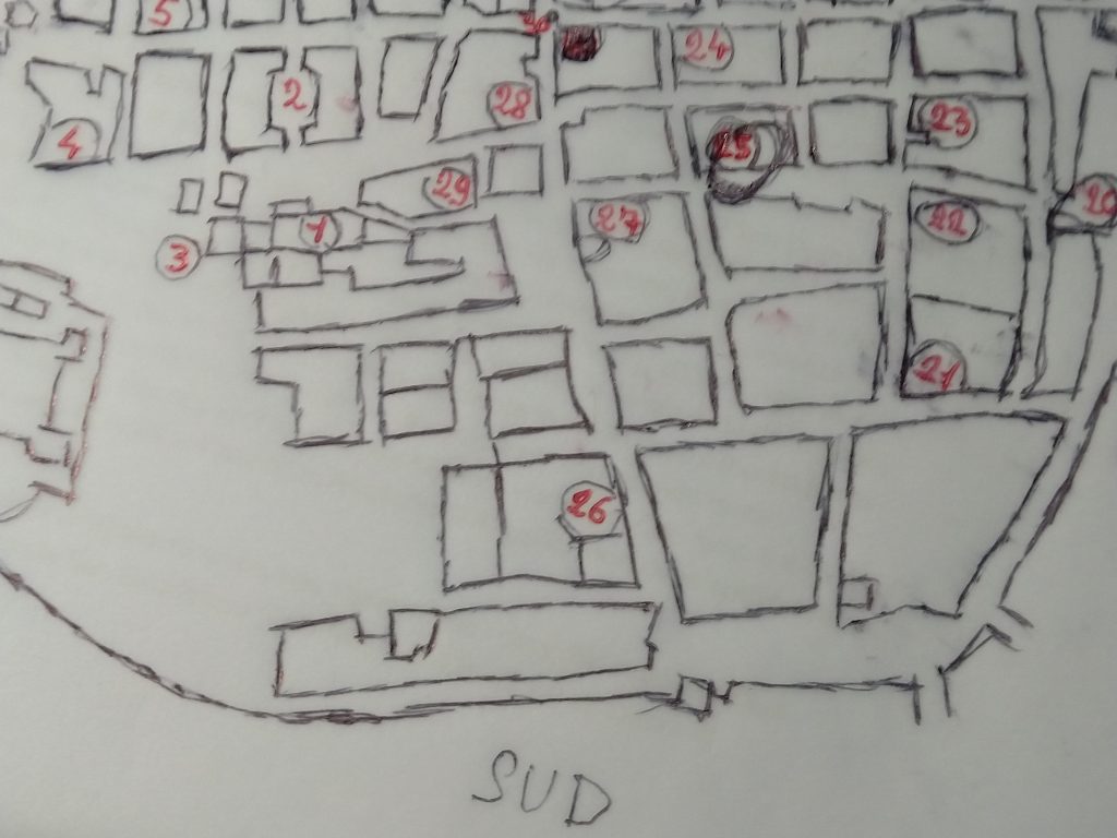 Ecco quindi l’elenco degli edifici della prima parte (nella foto l’illustrazione A) indicati con i relativi numeri: