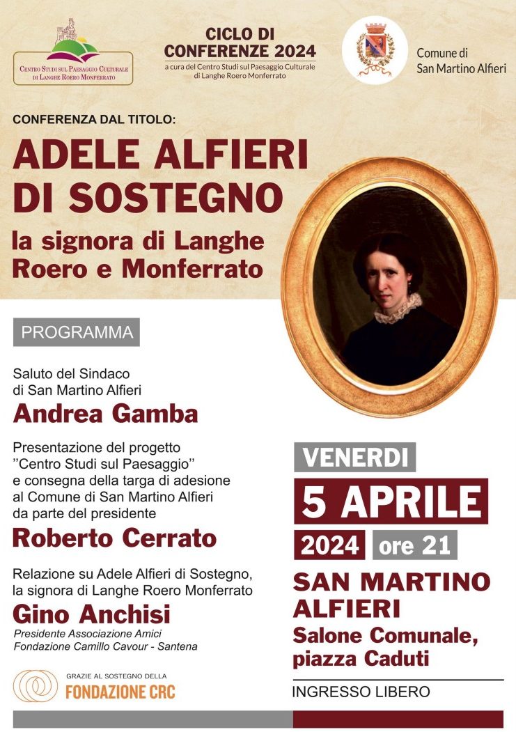 Organizzata dal centro studi sul paesaggio Culturale di Langhe Roero e Monferrato con il Comune di San Martino Alfieri la conferenza su ADELE ALFIERI DI SOSTEGNO la signora di Langhe Roero e Monferrato.