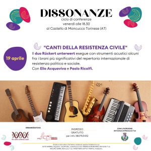Venerdì 19 aprile alle 18.30 al castello di Moncucco Torinese il duo Ruckert unterwert eseguirà alcuni dei brani più significativi del repertorio internazionale di resistenza politica e sociale. Il duo è composto da Elio Acquaviva (canto, flauti, percussioni, fisarmonica e chitarra acustica) e Paolo Ricolfi (canto, chitarra acustica e resofonica, irish bouzouki ed armonica).