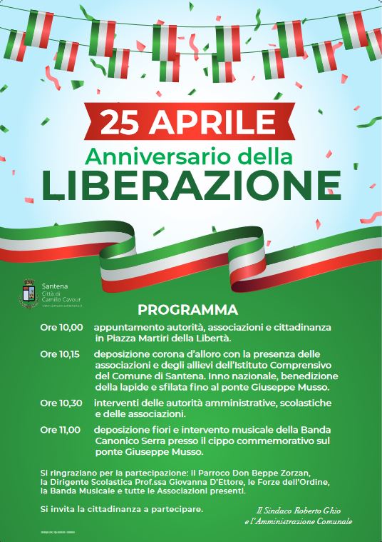 In occasione del 25 Aprile, giorno della celebrazione della Liberazione, la Città di Santena si prepara a commemorare questo momento importante della storia italiana.Il programma delle celebrazioni coinvolgerà le autorità locali, le associazioni e la cittadinanza. Appuntamento alle ore 10:00 in Piazza Martiri della Libertà per dare inizio alla giornata di commemorazione. Seguirà la deposizione di una corona d’alloro, accompagnata dall’inno nazionale e dalla benedizione della lapide, con la partecipazione delle associazioni e degli allievi dell’Istituto Comprensivo del nostro Comune.Alle 10:30, le autorità amministrative, scolastiche e le associazioni interverranno per condividere riflessioni e ricordi legati a questo giorno così importante per la nostra storia collettiva.Alle ore 11:00, presso il cippo commemorativo sul ponte Giuseppe Musso, si terrà la deposizione dei fiori e un intervento musicale della Banda Canonico Serra, per onorare la memoria di coloro che hanno sacrificato tanto per la nostra libertà.Un ringraziamento speciale al Parroco Don Beppe Zorzan, alla Dirigente Scolastica Prof.ssa Giovanna D’Ettore, alle Forze dell’Ordine, alla Banda Musicale e a tutte le Associazioni presenti per il loro contributo alla realizzazione di questo evento.