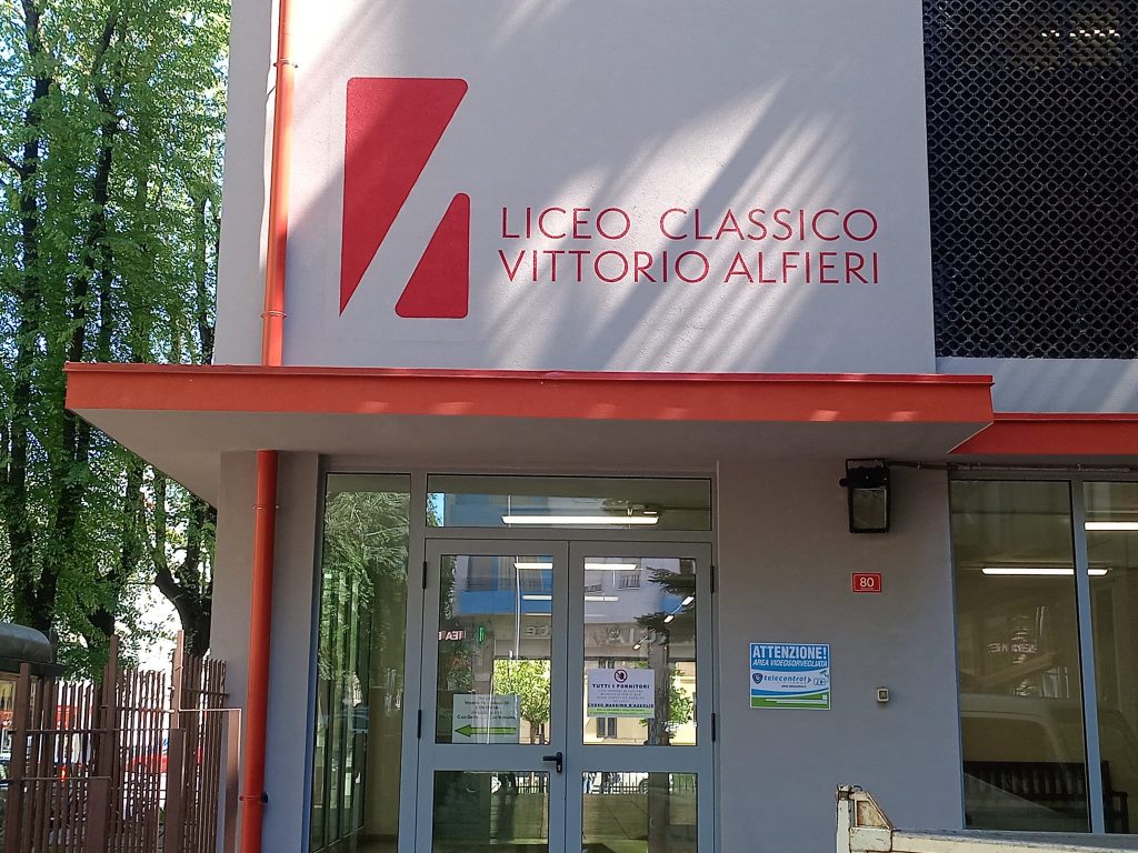 A completamento dei lavori di ristrutturazione realizzati al Liceo Vittorio Alfieri a Torino, sul fronte della palazzina aule è stata realizzata la scritta in rosso con il logo della scuola.