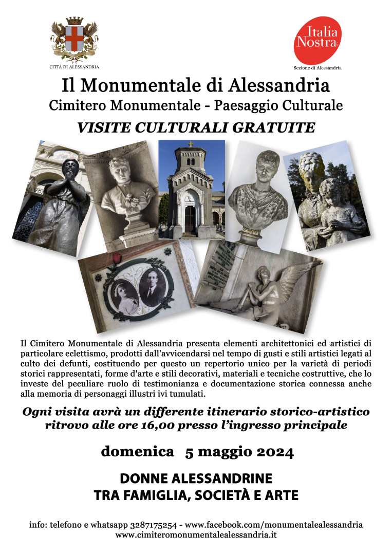 Domenica 5 maggio 2024 avrà luogo la visita culturale al Cimitero Monumentale di Alessandria organizzata dalla Sezione di Alessandria di Italia Nostra con la collaborazione del Comune di Alessandria, unitamente alla società Cimiteri Alessandrini s.r.l.