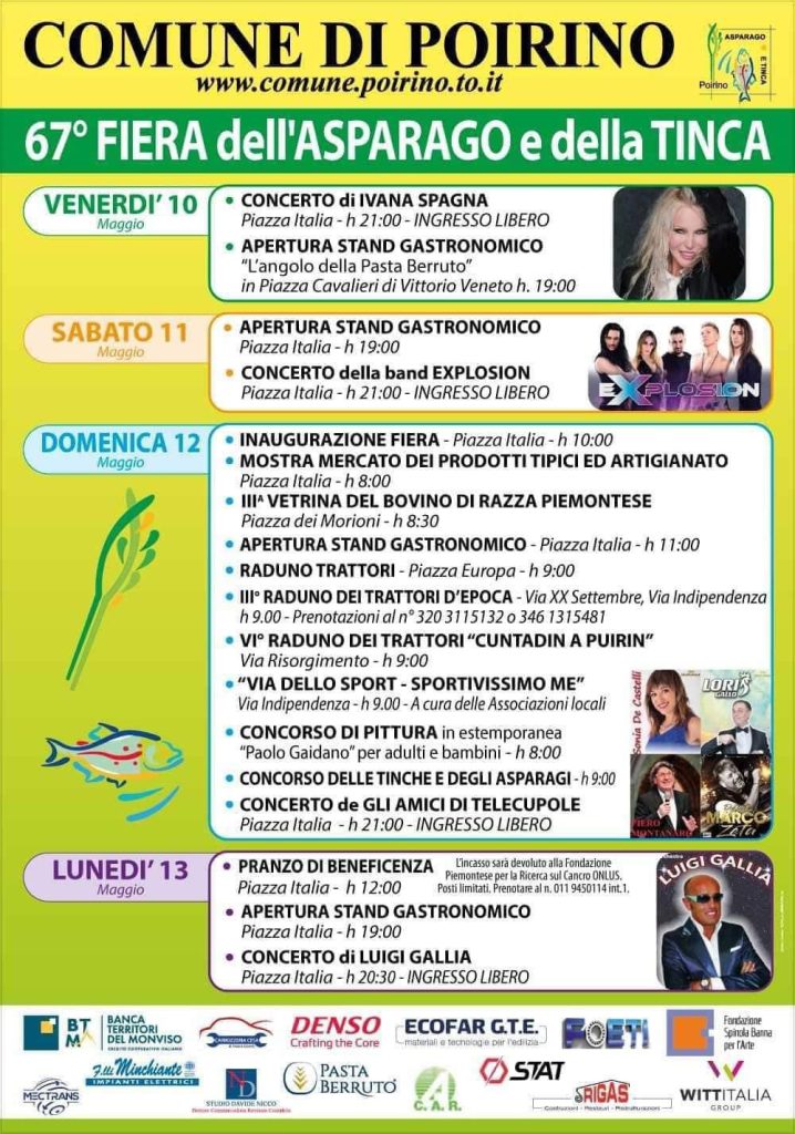 Poirino. Il programma della 67^Fiera dell’Asparago e della Tinca 🗓 di Redazione · 27 Aprile 2024 Appuntamenti dal 10 al 13 maggio. Si comincia con il concerto di Ivana Spagna Visto da: 1.732 from 10 Maggio 2024 to 13 Maggio 2024 Scheduled POIRINO CARMAGNOLA VILLASTELLONE CARIGNANO