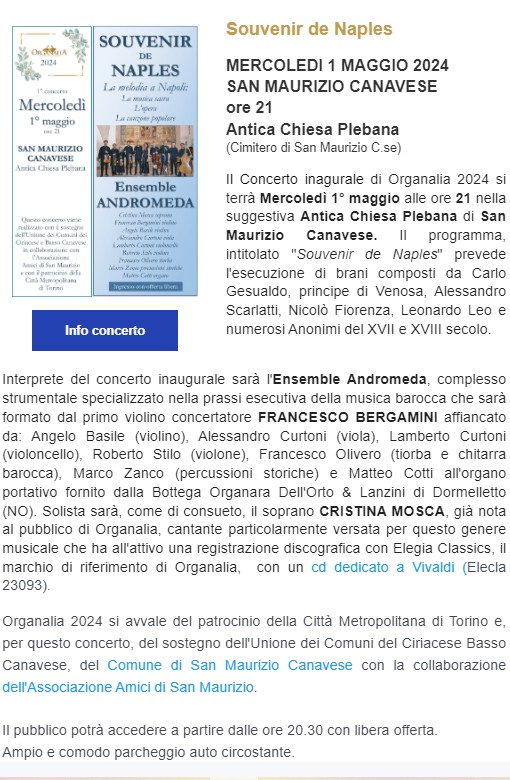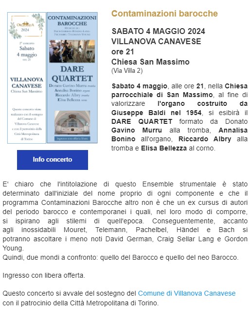 Sabato 4 Maggio a Villanova Canavese nella Chiesa di San Massimo alle ore 21 con Contaminazioni Barocche