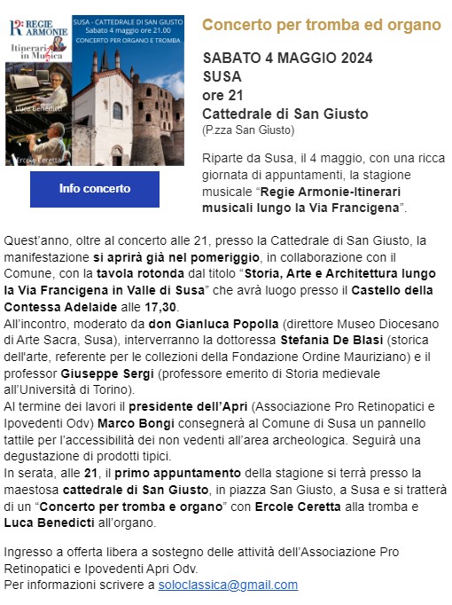 Sempre sabato 4 Maggio alle ore 21 a Susa nella Cattedrale di San Giusto “Concerto per tromba e organo” con Ercole Ceretta alla tromba e Luca Benedicti all’organo.