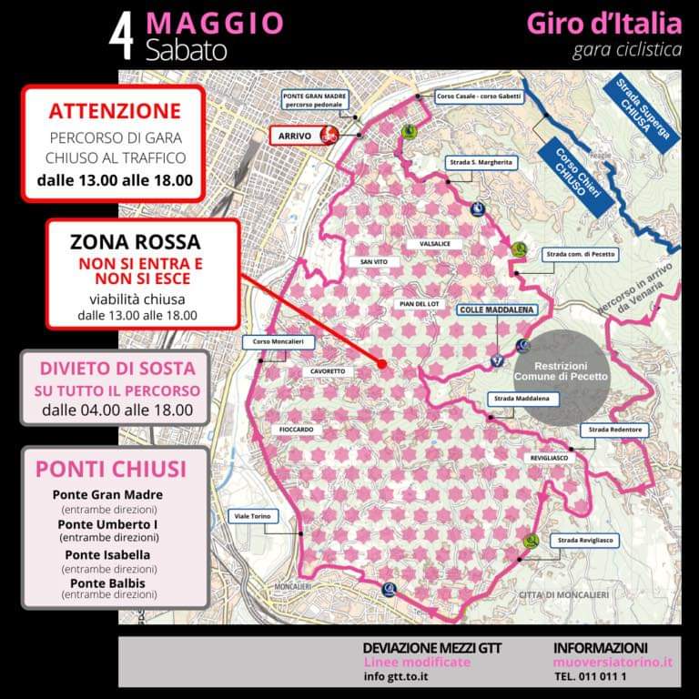 Torino e collina. Sabato 4 c’è il Giro d’Italia. La mappa delle ‘chiusure’