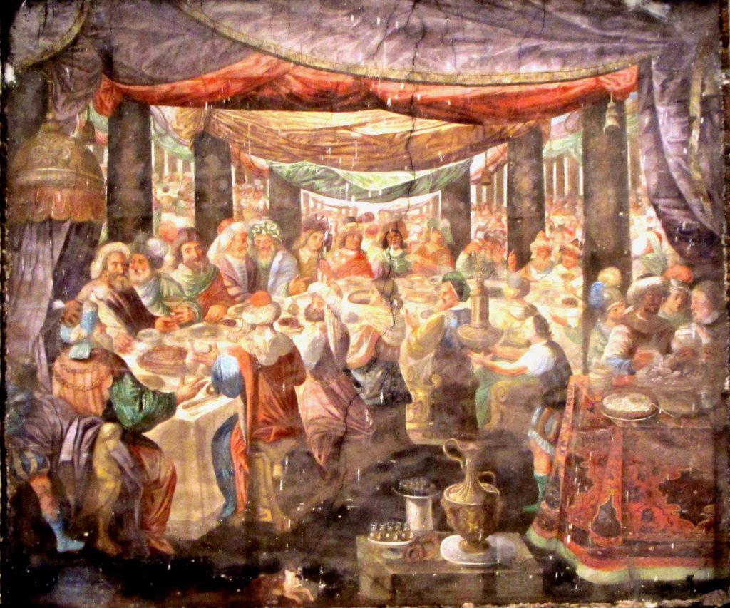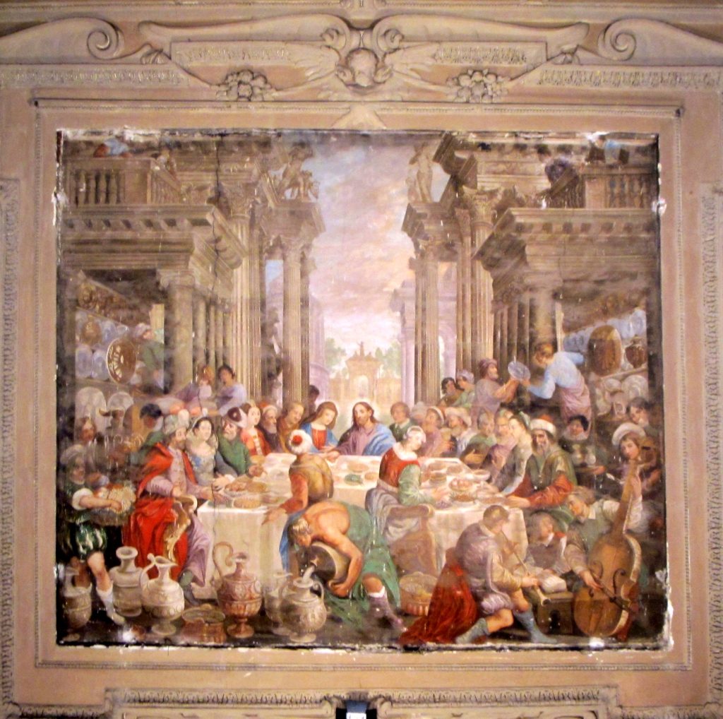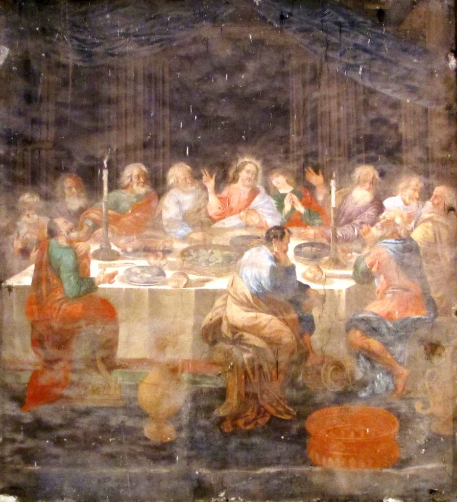 E quando, nel 1996,  furono rimossi dalla parete destra anche i due quadri di Sebastiano Taricco per sottoporli a restauro, anche sotto di essi comparvero affreschi dell’Ultima Cena (3)  e del Convito di Assuero (4). Si capì, perciò, che anche le pareti laterali erano state dipinte dalle stesse maestranze, ma che solo due o tre decenni dopo i loro affreschi, senza per fortuna venir cancellati, erano stati ricoperti con tele. Come mai? Cosa era accaduto? Si è detto che gli affreschi potrebbero essere stati sostituiti perché deteriorati. In realtà essi sono in discreto stato di conservazione.
