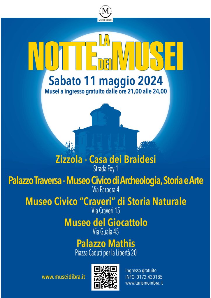 Nella serata di sabato 11 maggio tutte le strutture che fanno parte del circuito museale braidese – il Museo di archeologia, storia e arte di Palazzo Traversa, il Museo Craveri di storia naturale, il Museo del Giocattolo e il museo multimediale della “Casa dei braidesi” ospitato all’interno della Zizzola – saranno straordinariamente aperti ad ingresso gratuito dalle 21 alle 24. Medesima apertura è prevista anche per Palazzo Mathis, all’interno del quale è possibile ammirare fino al 26 maggio la mostra personale dell’artista torinese Mario Giammarinaro “Paesaggi inquieti”.