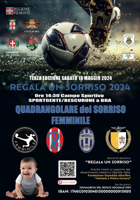 SABATO 18 MAGGIO 2024, a BRA presso Campi Sportivo Sportgente/Bescurone, a partire dalle ore 14.30, QUADRANGOLARE FEMMINILE DEL SORRISO (con la partecipazione della Nazionale Vaticana, Rosselli, Racco 86 ed Area Calcio Alba).