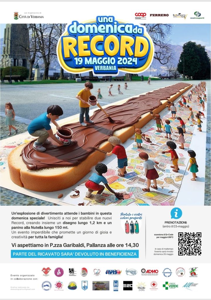 “Una domenica da record” con il tentativo di record per la realizzazione del disegno più lungo del mondo (1,2 km) e del panino alla nutella più lungo, che si svolgerà domenica 19 maggio, l’iniziativa si svilupperà lungo tutto il lungolago di Pallanza a Verbania (da Piazza Garibaldi e per tutto viale delle Magnolie). Quindi il viale sarà chiuso al traffico per permettere l’esecuzione del disegno da parte dei 1200 bambini, dalle 9 alle 18.00.