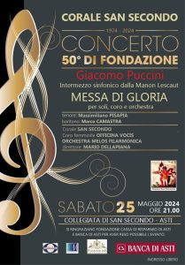 L’associazione Corale San Secondo, per celebrare il 50° anniversario dalla sua fondazione, ha organizzato per Sabato 25 Maggio alle ore 21 presso la Collegiata San Secondo di Asti un Concerto in cui verrà eseguita la Messa di Gloria di Giacomo Puccini, preceduta dall’Intermezzo sinfonico della Manon Lescaut, ricordando così anche il centenario della morte del Maestro lucchese.