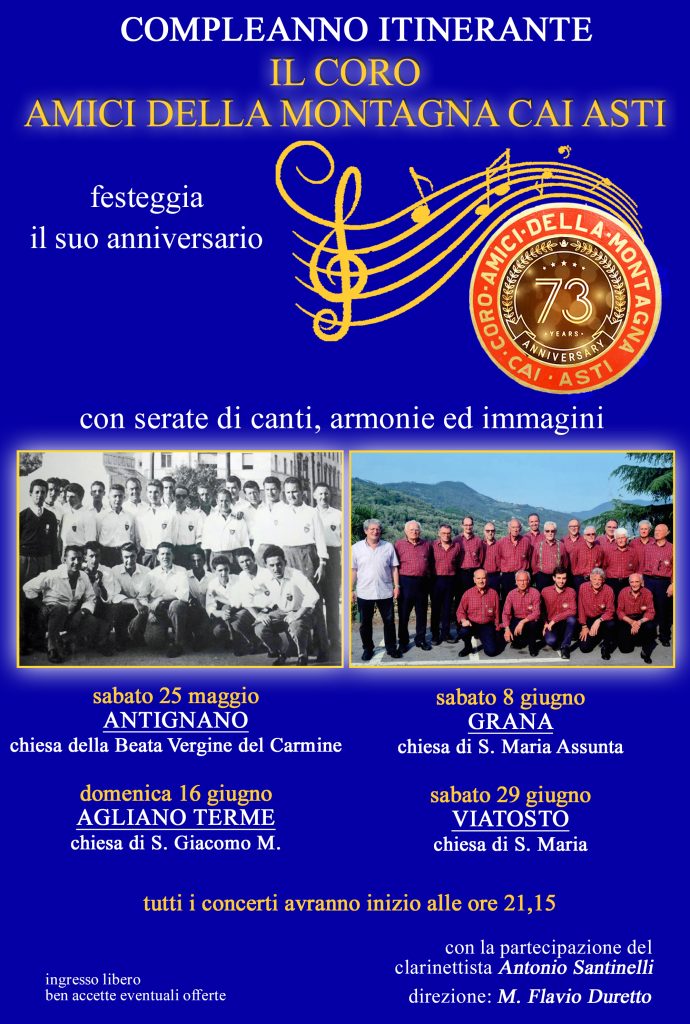 Sabato 8 giugno, alle ore 21,15, la Chiesa parrocchiale Assunzione di Maria Vergine di Grana Monferrato ospiterà il “Coro Amici della Montagna CAI Asti” in una delle quattro tappe di concerti previsti per festeggiare il 73° anniversario della sua fondazione.Simpaticamente battezzato “Compleanno Itinerante”, questo ciclo di concerti, oltre che a Grana Monf.to, farà tappa il 25 maggio ad Antignano, il 16 giugno ad Agliano Terme e il 29 giugno ad Asti (Viatosto).