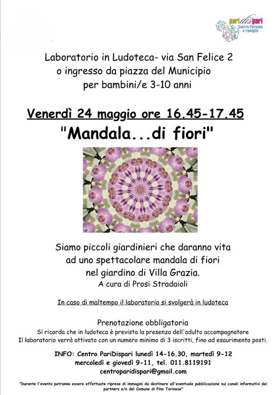 Venerdì 24 maggio, dalle ore 16:45 alle ore 17:45, nel giardino di Villa Grazia, si terrà il laboratorio “Mandala di fiori”, dedicato ai bimbi e alle bimbe dai 3 ai 10 anni.