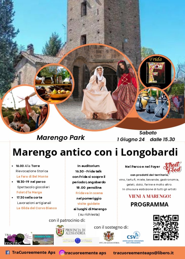 Sabato 1° giugno dalle ore 15,30, il complesso di Marengo sarà animato da un grande evento storico culturale “Marengo Antico con i Longobardi” nato da un’idea originale dell’Associazione “Tra Cuore e Mente”, condivisa e progettata con l’Unione Giornalisti e Comunicatori Europei, insieme all’Associazione Lisondria Ades.