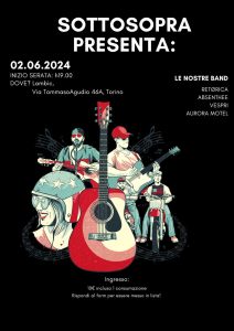 Domenica 2 giugno alle ore 19 si terrà al Lambìc di Via Tommaso Agudio 46 a Torino l’evento musicale “Sottosopra”. Il concerto vedrà la partecipazione delle band Retorica, Absenthee, Vespri e Aurora Motel. Tutti e quattro i gruppi musicali sono composti da giovani talentosi e all’avanguardia provenienti da Torino e provincia.
