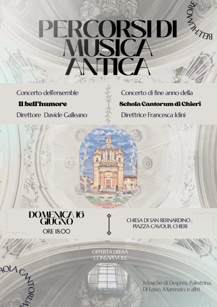 L’evento vedrà la partecipazione dell’ensemble torinese “Il Bell’humore”, sotto la direzione di Davide Galleano e della nuova formazione “Schola Cantorum di Chieri”, che termina il proprio primo anno di attività, diretta da Francesca Idini.