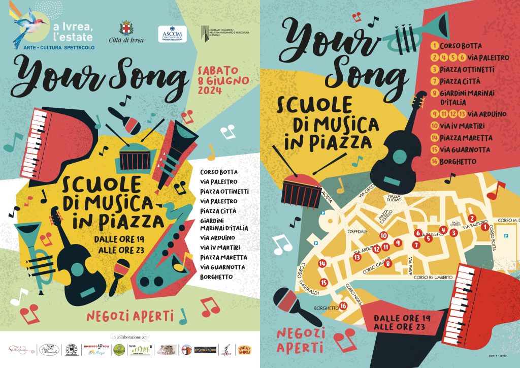 Il prossimo sabato 8 giugno la musica risuonerà per le vie di Ivrea in occasione della seconda edizione dell’evento musicale YOUR SONG, la manifestazione sonora dedicata alle giovani promesse del nostro territorio, rappresentate dai bambini e dai ragazzi delle scuole di musica cittadine.