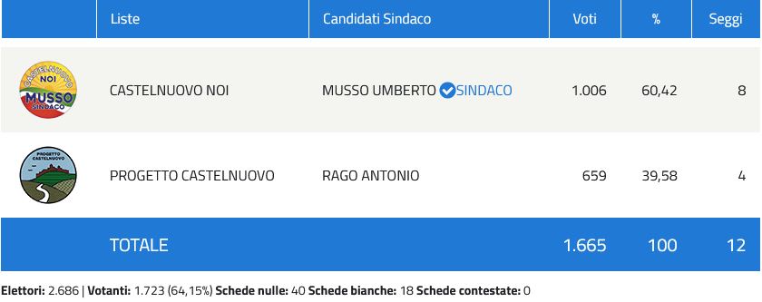 Umberto Musso, figlio d’arte (il padre, Giorgio, è stato uno storico primno cittadino castelnovese) ha vinto nettamente il duello con il sindaco uscente Antonio Rago: 60,42% il dato per il vincitore, a fronte del 39,58% di Rago