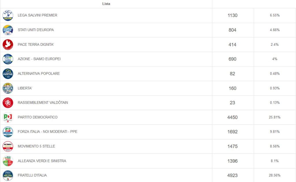 28,56% contro 25,81%. A seguire Forza Italia (9,81%), Movimento 5 Stelle (8,56%), Alleanza Verdi Sinistra (8,1%), Lega (6,55%) e Stati Uniti d’Europa ( 4,66%)