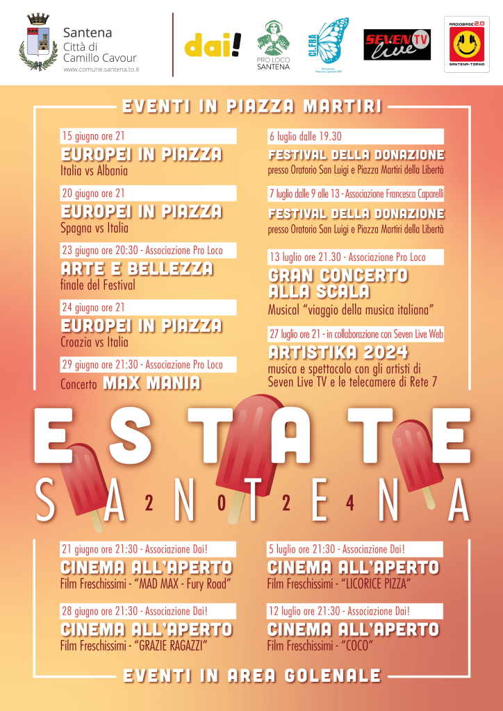 Il 6 e il 7 luglio l’Associazione Francesca Caparelli organizza la prima edizione del Festival della Donazione presso Oratorio San Luigi e Piazza Martiri della Libertà. Appuntamento sabato 6 con il torneo di beach volley che si svolgerà presso l’oratorio San Luigi dalle 15 alle 21 e a partire dalle 19:30, Radiobase 2.0 animerà la serata in piazza Martiri e domenica 7 dalle 9:00 alle 13:00 si svolgeranno podcast divulgativi in materia di prevenzione e informazione sul tema delle malattie oncologiche. Il 13 luglio, in piazza Martiri, alle ore 21:30 ci sarà il Gran Concerto alla Scala – Musical “Viaggio nella Musica Italiana”, organizzato dall’Associazione Pro Loco. Sempre in piazza Martiri, il 27 luglio alle ore 21:00 per Artistika 2024, si prospetta una notte di musica e spettacolo con gli artisti di Seven Live TV e le telecamere di Rete 7, organizzato dal Comune di Santena in collaborazione con Seven Live TV.