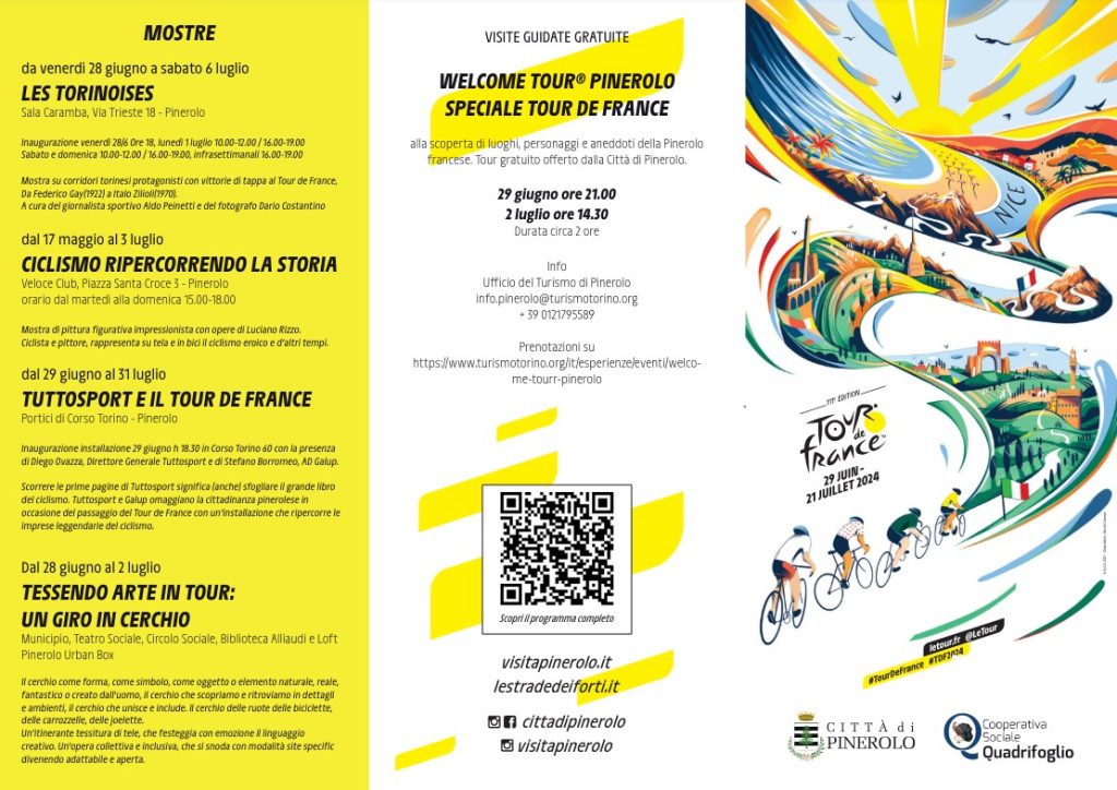 Infine, la città di Pinerolo sarà la protagonista delle due visite guidate gratuite di WELCOME TOUR® PINEROLO – SPECIALE TOUR DE FRANCE, percorsi alla scoperta di luoghi, personaggi e aneddoti della Pinerolo francese. Tour gratuito offerto dalla Città di Pinerolo previsto il 29 giugno ore 21.00 e il 2 luglio ore 14.30. Durata circa 2 ore, info e prenotazioni su: https://www.turismotorino.org/it/esperienze/eventi/welcome-tourr-pinerolo