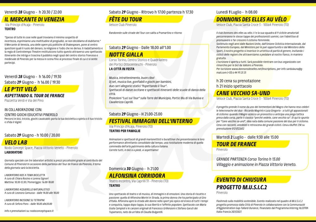 Si parte venerdì 28 giugno con Il Mercante di Venezia, spettacolo itinerante che intriga e trascina il pubblico negli spazi del centro storico francese e medievale di Pinerolo. Sempre venerdì 28 (con replica il 29) i bambini potranno partecipare a Le P’tit Veló. Aspettando il Tour de France, percorsi in bici, triciclo, giochi cavalcabili in Piazzetta Verdi e via del Pino. Sabato 29 giugno sarà una delle giornate più ricche. In attesa della Notte Gialla che animerà Pinerolo con Dj set, musica live, gonfiabili e giochi per bambini, due carri allegorici statici (dalle 18.00 all’1.00 in Corso Torino, Centro Storico e Quadrilatero dei Portici Ottocenteschi) già dal mattino sarà possibile partecipare a uno dei tre laboratori Velo Lab presso Nodo Concept Space (P.zza Vittorio Veneto) per realizzare creazioni sul tema della bicicletta. Alle 17.00 parte invece la Fete du Tour, randonnée sulle strade del Tour con salita a Pramartino e ritorno. Dalle 21.00 alle 23.00 in Via Principi d’Acaja tornano le animazioni e gli spettacoli di grandi marionettisti e burattinai con il Festival Immagini dell’Interno.