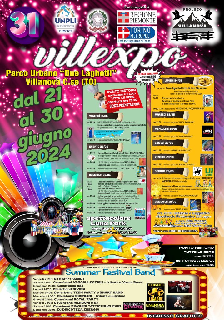 Da venerdì 21 a domenica 30 giugno torna Villexpo, il festival di Villanova Canavese che propone buona cucina, ottima musica per tutti i gusti e le età, tanta allegria e aggregazione. L’appuntamento è nella sede storica della manifestazione, al parco Due Laghetti. Il punto ristoro sarà gestito dalla Pro Loco e sarà aperto tutte le sere a partire dalle 19,30 senza prenotazione. La serata inaugurale del 21 giugno proporrà il taglio del nastro alle 19,30, alla presenza delle autorità regionali, metropolitane e locali e con l’animazione musicale della Filarmonica Villanovese.