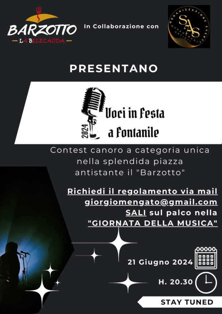 Venerdì 21 giugno 2024, giornata della Festa della Musica, a Fontanile, in provincia di Asti, si terrà la prima edizione del concorso canoro “Voci in Festa a Fontanile”, evento organizzato dal locale “Barzotto – La Belecauda di Fontanile” in collaborazione con l’agenzia SAAS di Samuel Accomo.