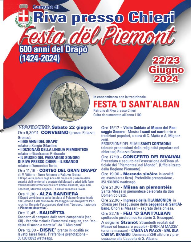 Riva presso Chieri: la Festa di Sant’Albano con la Festa del Piemonte di Redazione · 18 Giugno 2024 Il programma del doppio evento di sabato 22 e domenica 23 giugno Visto da: 1.624